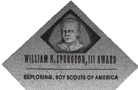 The William H. Spurgeon, III Award was developed in 1971 in honor of the man who is regarded as the major leader in the development of special interest Exploring. Mr. Spurgeon was a business executive at the Irvine Company in Southern California who personally organized many special interest posts in the 1960's. Mr. Spurgeon served for many years as a member of the National Council Executive Board and national Exploring Committee. His pioneering efforts led to the present contemporary Exploring Program. He devoted much of the late 1960's to promoting Exploring and is particularly remembered as a dynamic speaker for Exploring Impact Plan luncheons across America. Mr. Spurgeon passed away in 1970.